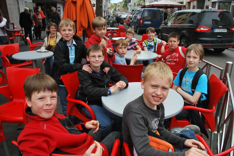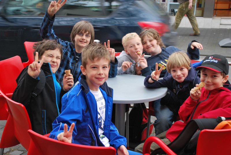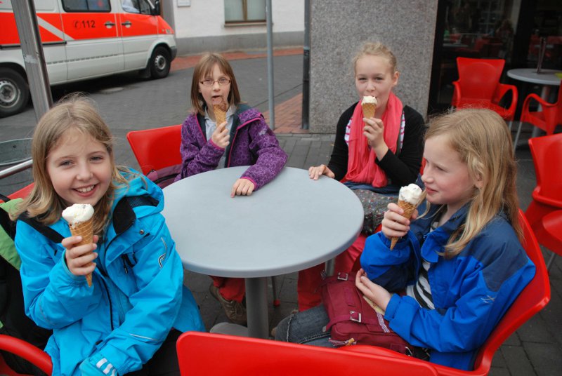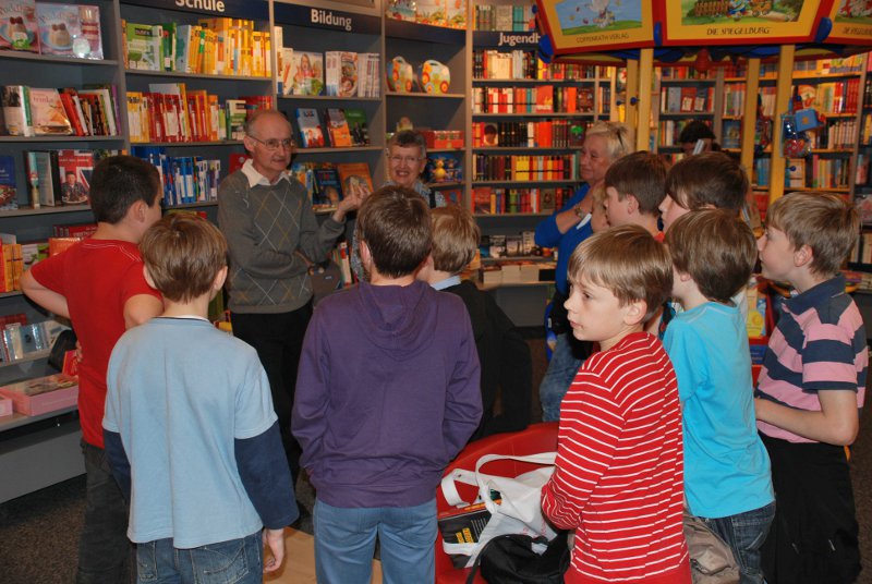 Die 4a mit Klassenlehrerin Frau Ratzlaff hatte sich derweil aufgeteilt. Während die Jungen unter Aufsicht von Schulleiterin Sandra Füllenbach vor der Eisdiele mit einer Eiswaffel "geparkt" waren, durften die Mädchen schon in der Buchhandlung Kayser Inhaber Norbert John über seinen Beruf als Buchhändler befragen. Im Rotationsverfahren kamen schließlich alle Kinder an die Reihe und verließen die Buchhandlung mit einem kostenlosen Exemplar des Welttag-Buches “Die Kinder vom Brunnenplatz” der Autorin Christine Fehér. Auch dafür hatte sich der Weg gelohnt.