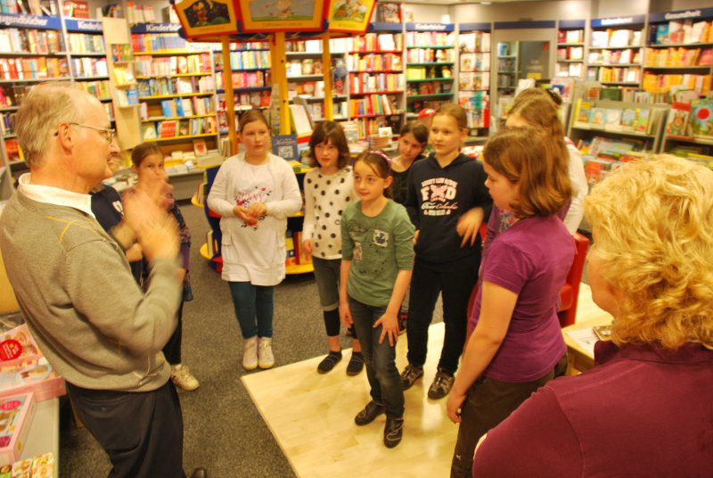 Aus Anlass des Welttag des Buches kamen die Klassen 4a und 4b am 10. Mai in die Buchhandlung Kayser und legten auch eine Lesepause auf dem Altstadtplatz ein.