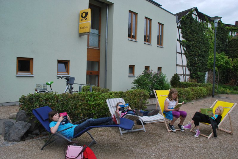 Nach knapp 5 km Wanderung stürzten sich die Jungen und Mädchen der Klasse 4b der KGS Merzbach begeistert auf die gemütlichen Liegestühle der "Lesewiese" des Vereins RHEINBACH LIEST. Allerdings nicht ohne sich vorher mit einem Buch aus den bereitstehenden Bücherkisten zu versorgen. Ohne dass Klassenlehrerin Frau Beitelstein viel sagen musste, entstand auf dem malerischen und vom Trubel abgeschirmten Altstadtplatz zwischen Pützgasse und Weiherstraße eine gemütliche Leseatmosphäre.