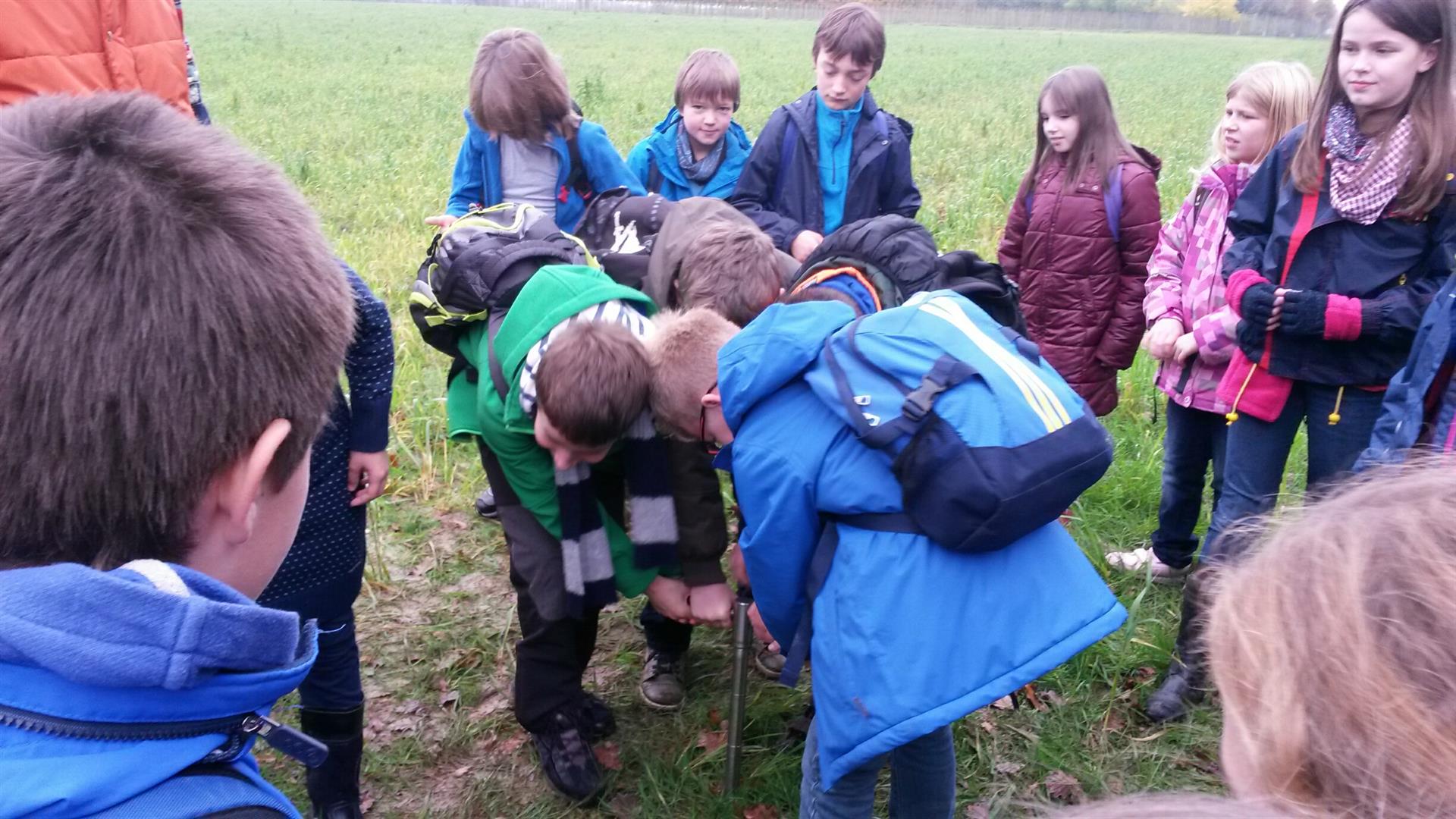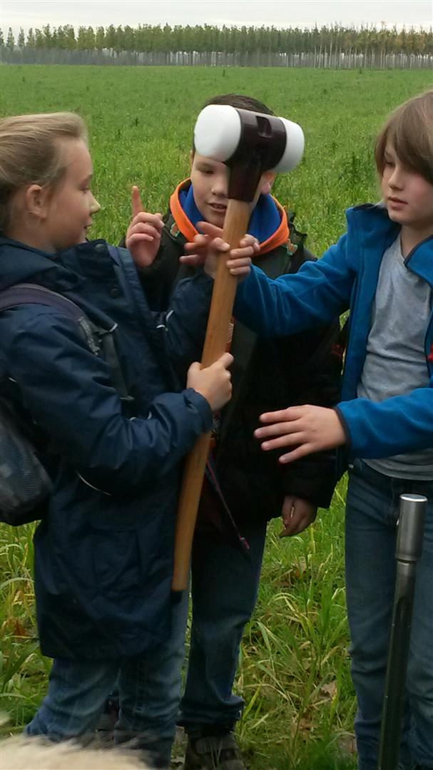 Am ZDI-Tag war die Klasse 4 der KGS Merzbach im Palotti-Kolleg in Rheinbach. Wir hatten das Thema Boden. Als erstes haben uns zwei Lehrer etwas über die Geräte erzählt, die man braucht, um Bodenproben zu nehmen. Die ganzen Geräte mussten erst mal auf einen großen Acker geschleppt werden. Wir haben das Probenentnahmegerät in den Boden geschlagen und wieder herausgedreht. Der Ackerboden war matschig und fühlte sich so an wie Knete.