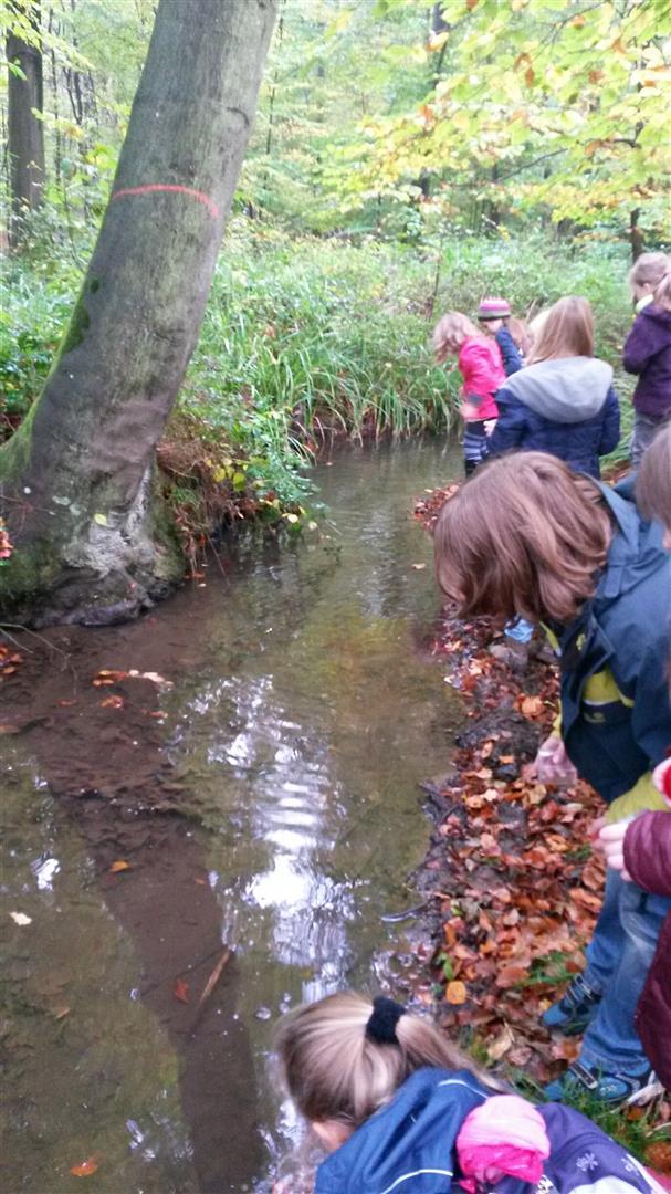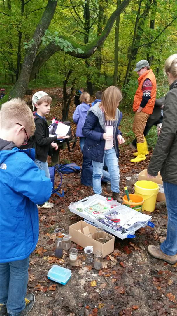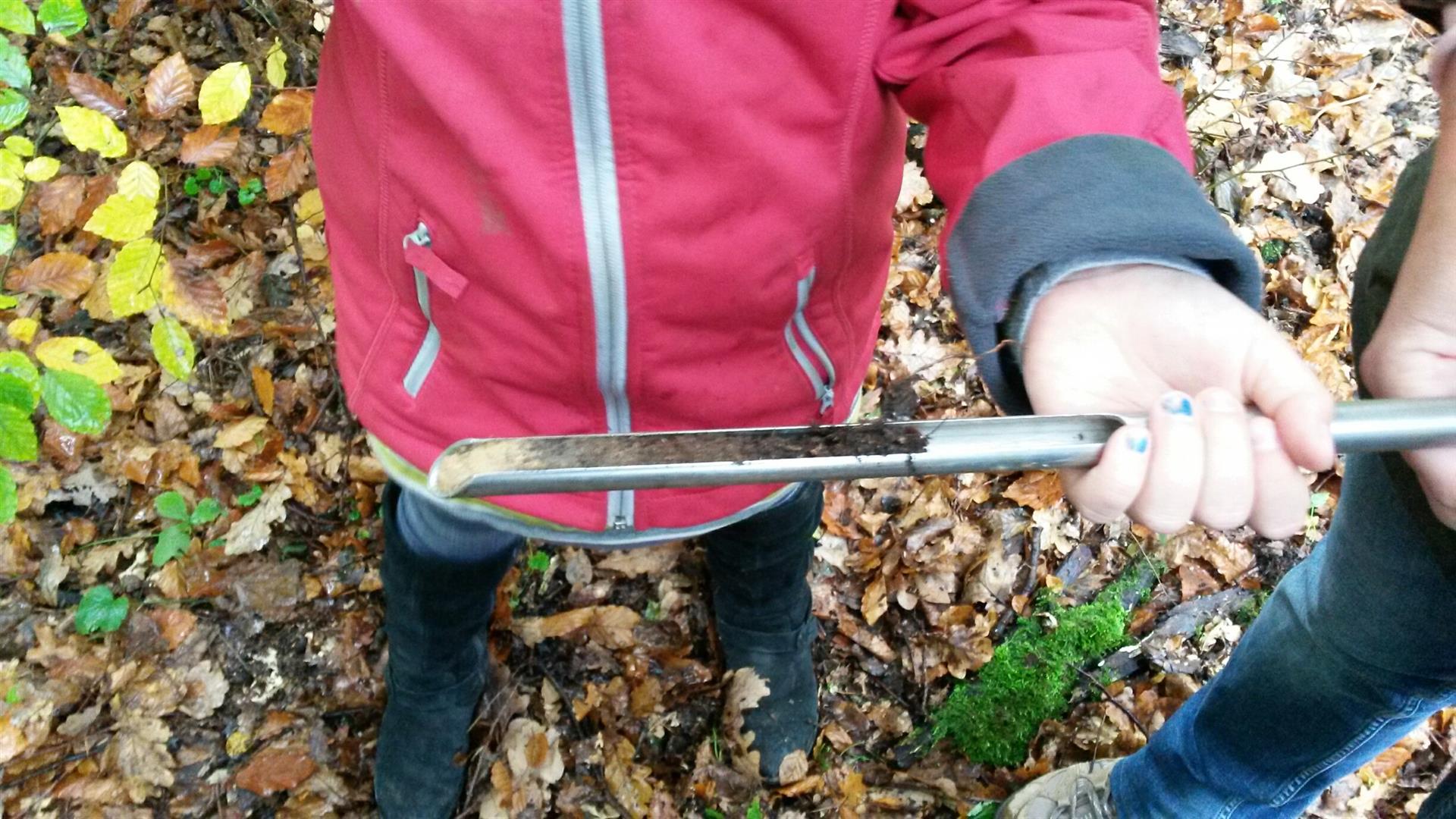 Sofort danach sind wir in den Wald, wo ein kleiner Bach fließt, gegangen und haben dort auch eine Bodenprobe genommen. Die Erde im Wald war viel trockener und krümeliger als die auf dem Acker und etwas rötlich. Das rötliche liegt am Eisen, das in der Erde ist. Das Eisen rostet und wird dadurch orange-rot.