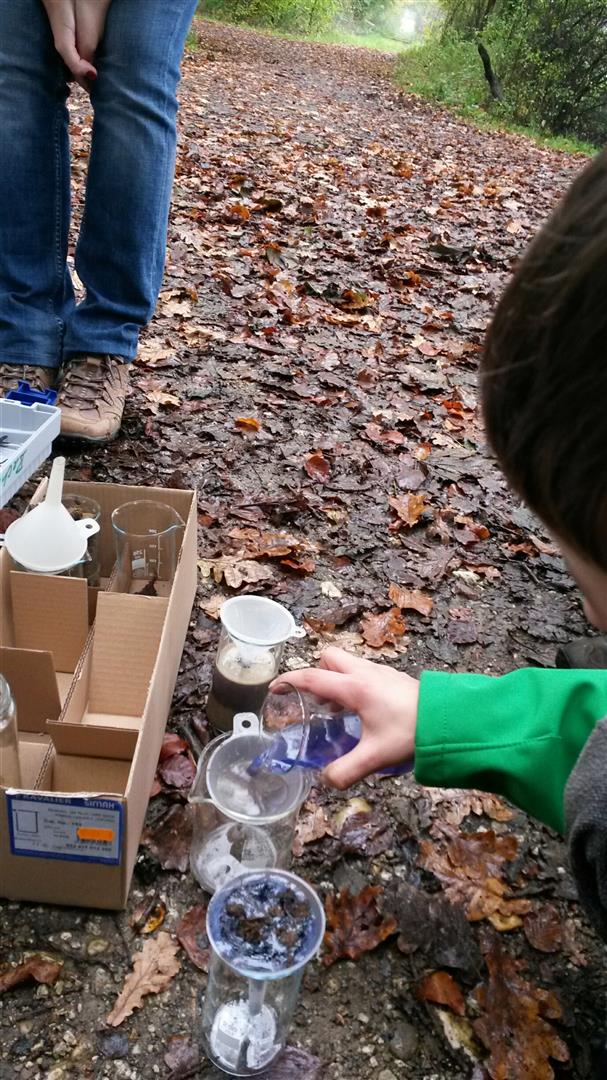 Danach durfte die ganze Klasse herumtoben und mit Becherlupen kleine Tiere des Waldes beobachten. Ein paar andere Kinder und ich haben geguckt, wie gut Sand und Blumenerde Wasser filtern können. Wir haben ein leeres Gefäß genommen und einen Trichter. Den Sand oder die Blumenerde haben wir in den Trichter gefüllt, so dass es nicht in das Gefäß rein gelangt. Wir haben blaue Tinte in das sehr klare Wasser getan, um es gut sichtbar zu machen. Dann haben wir erst einmal gewartet. Bei dem Sand hat es ein oder zwei Sekunden gedauert, Bei der Blumenerde 10-15 Minuten. Nach dieser Zeit war das Wasser durch die Trichter gelaufen. Bei dem Sand war das Wasser hellbraun, so wie Sand. Bei der Blumenerde hat es zwar lange gedauert, aber das Wasser war ziemlich klar. Blumenerde filtert daher am besten.