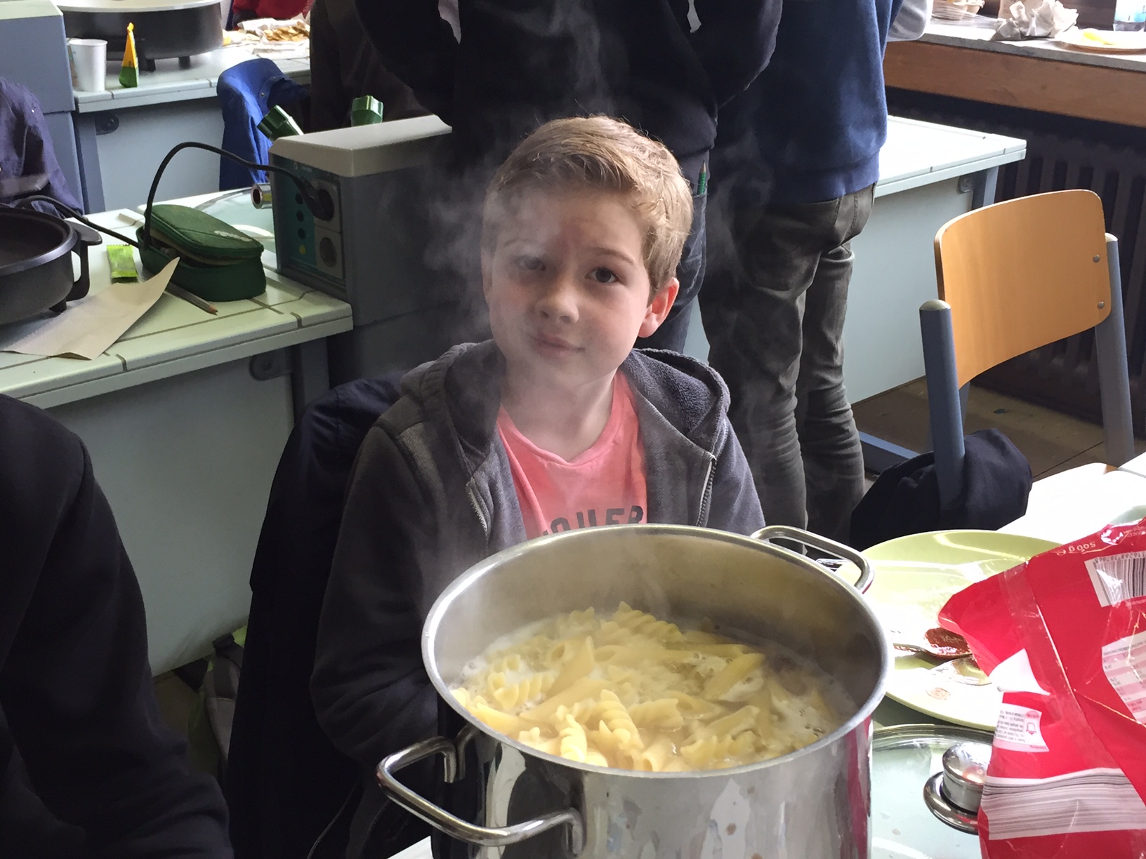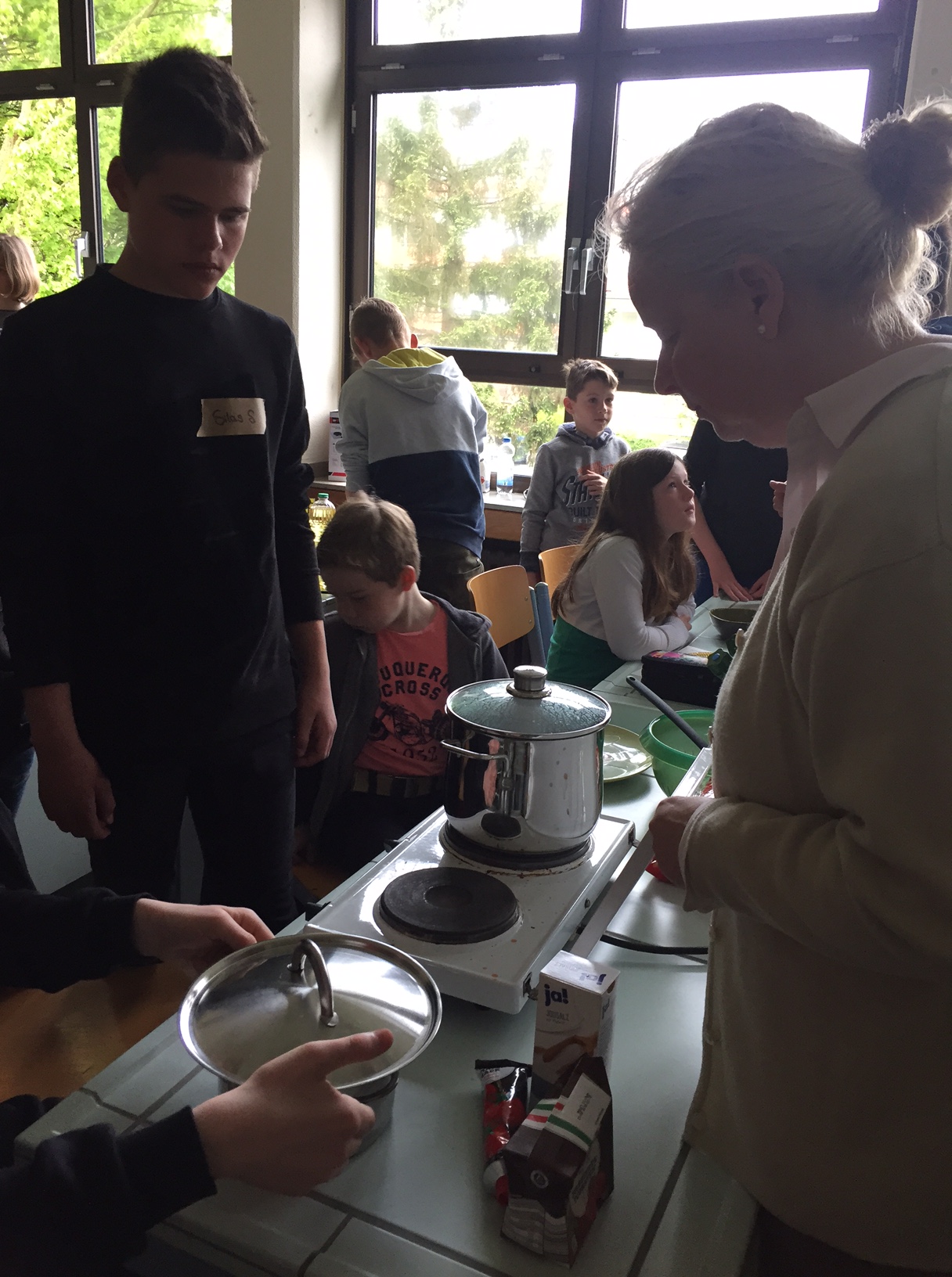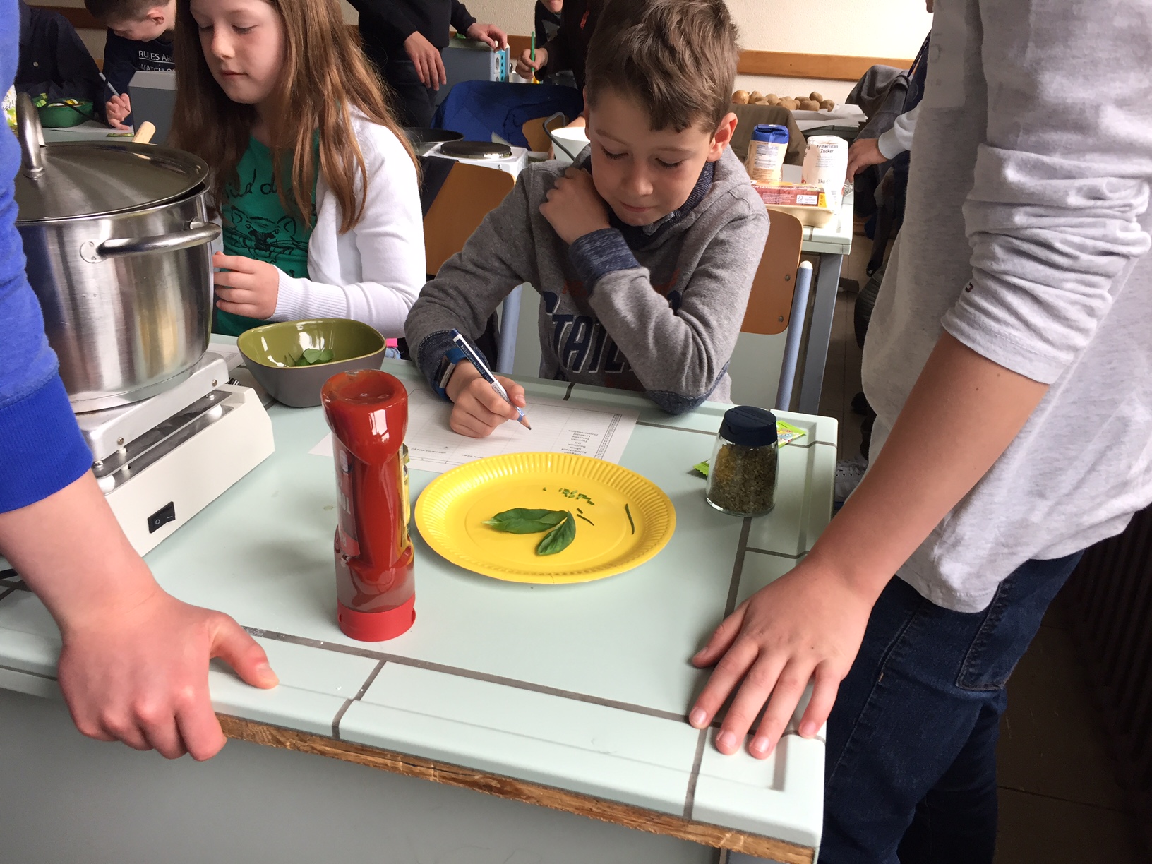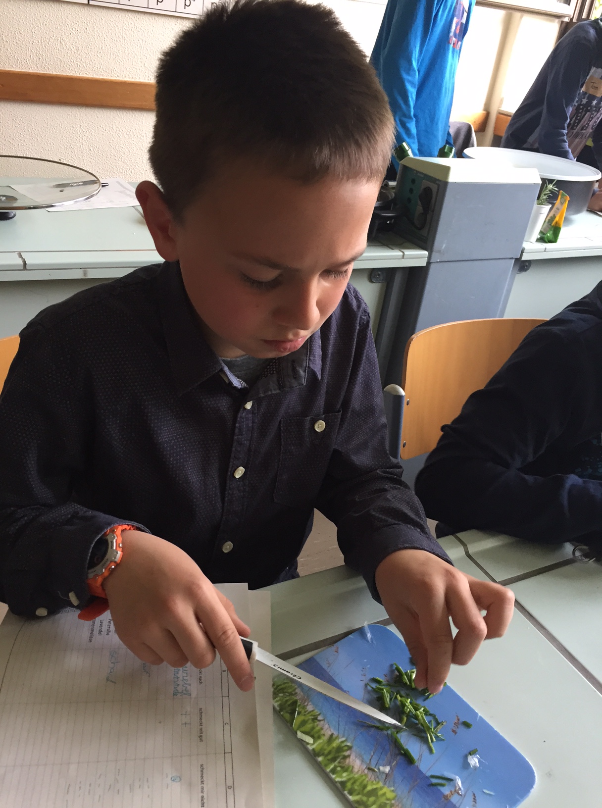 Am 3.5. war die Klasse 3a im Städtischen Gymnasium zu Gast und nahm an dem Projekt "Kochen mit Kräutern" teil. Zunächst hielten ein paar Kinder der Klasse 8 ein tolles Referat zum Thema Nutzpflanzen. Dann bekamen die 3.-Klässler jeweils einen Partner aus der Klasse acht und dann ging es auch schon an die Kochtöpfe. Es gab Bratkartoffeln, Nudeln mit Sauce und auch Pfannekuchen - alles mit Kräutern.