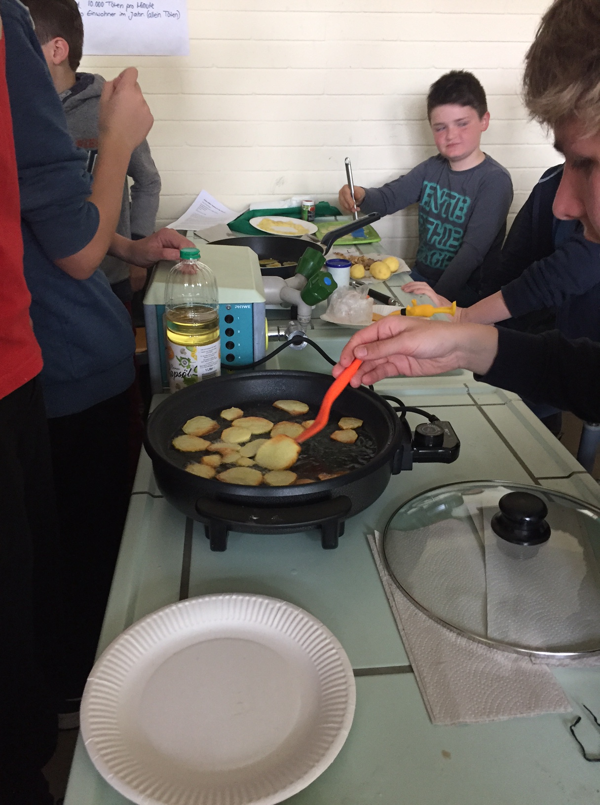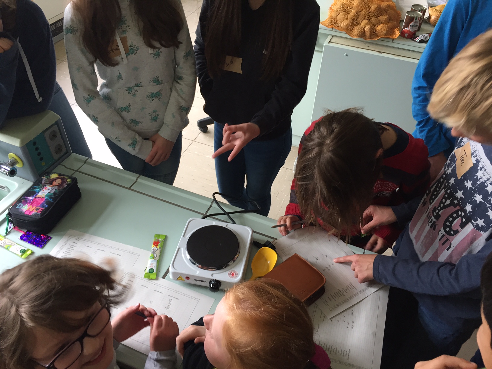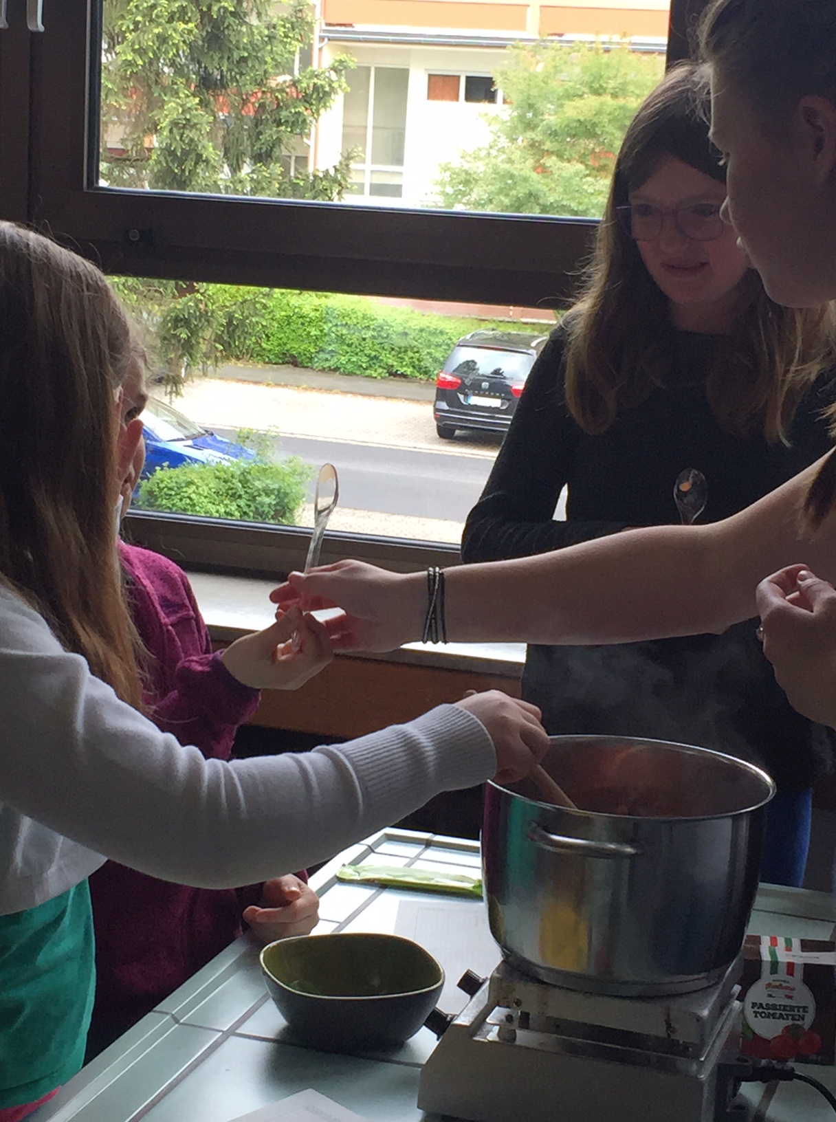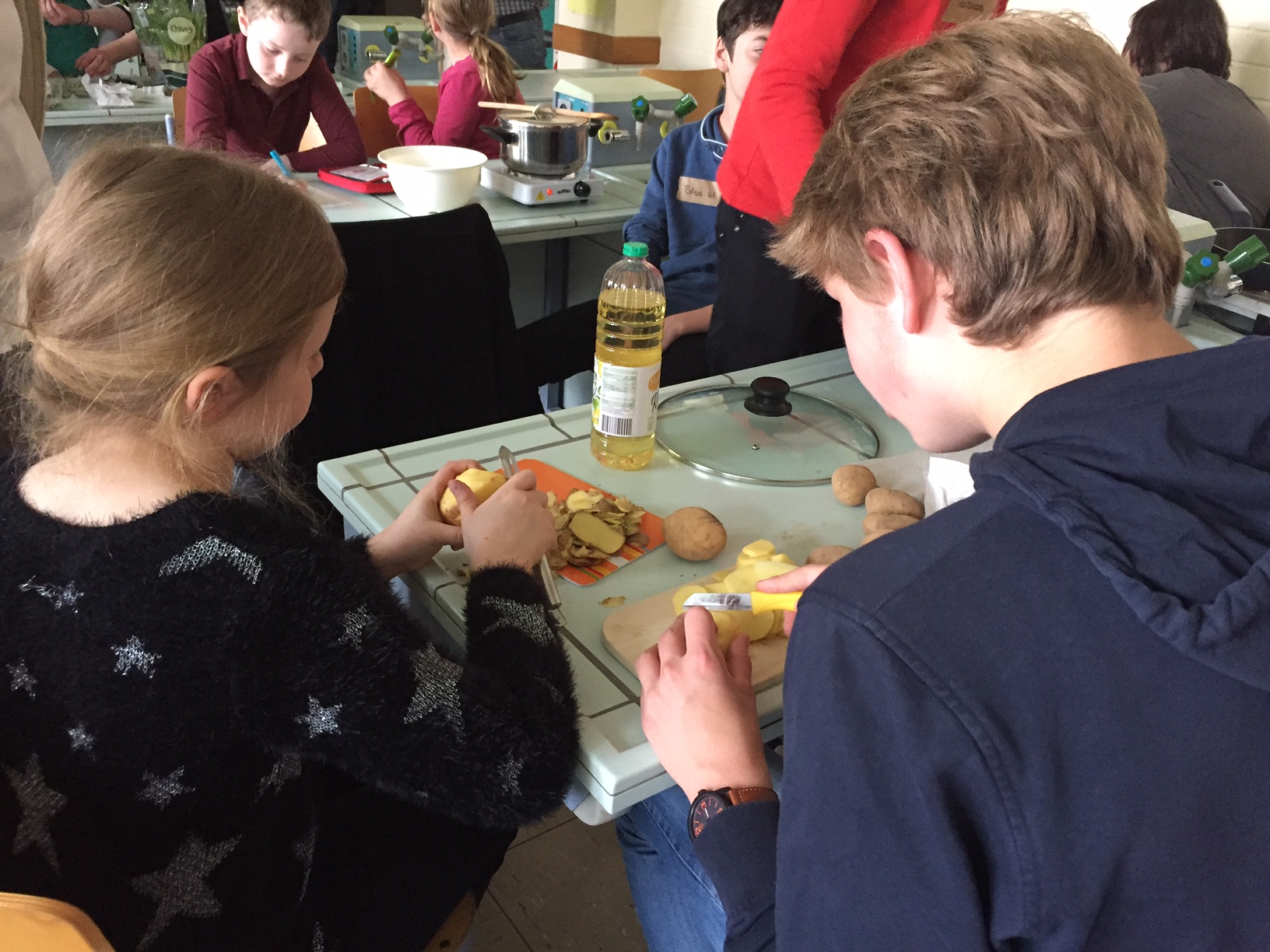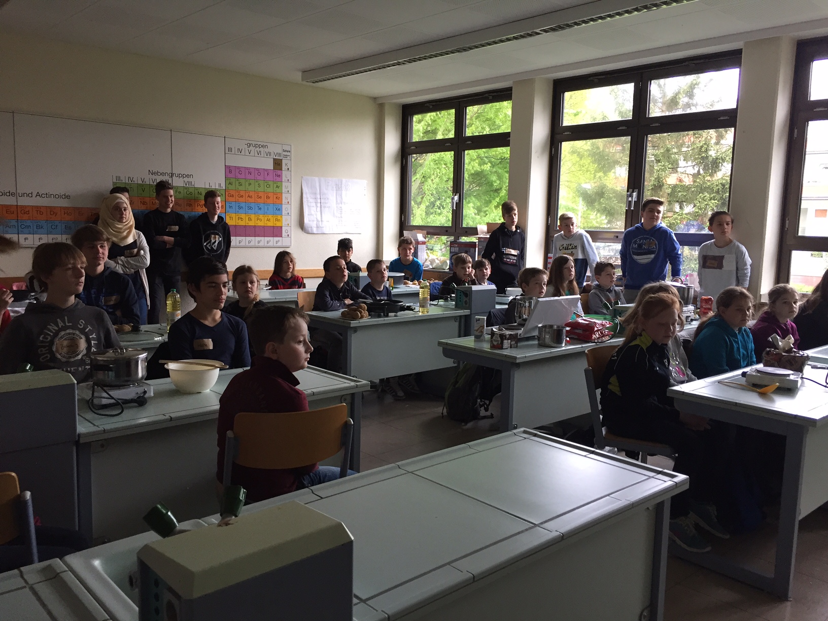 Am 3.5. war die Klasse 3a im Städtischen Gymnasium zu Gast und nahm an dem Projekt "Kochen mit Kräutern" teil. Zunächst hielten ein paar Kinder der Klasse 8 ein tolles Referat zum Thema Nutzpflanzen. Dann bekamen die 3.-Klässler jeweils einen Partner aus der Klasse acht und dann ging es auch schon an die Kochtöpfe. Es gab Bratkartoffeln, Nudeln mit Sauce und auch Pfannekuchen - alles mit Kräutern.