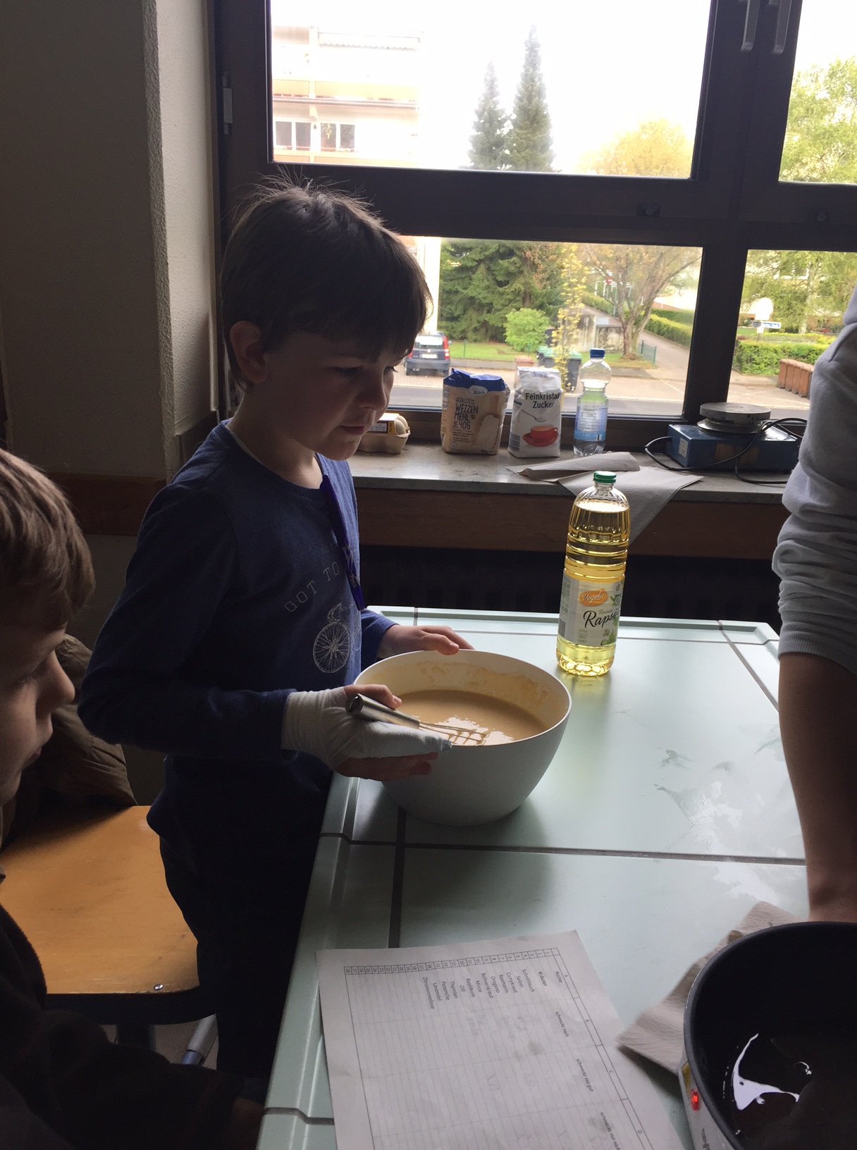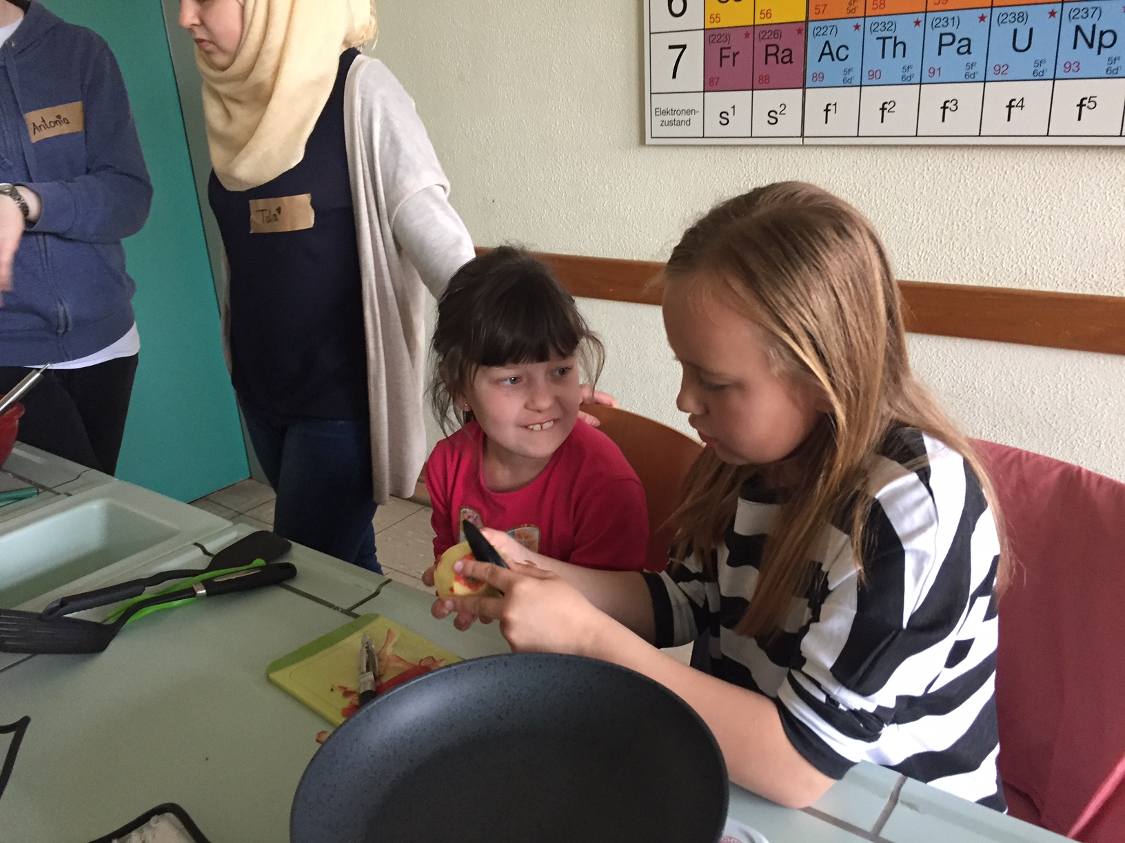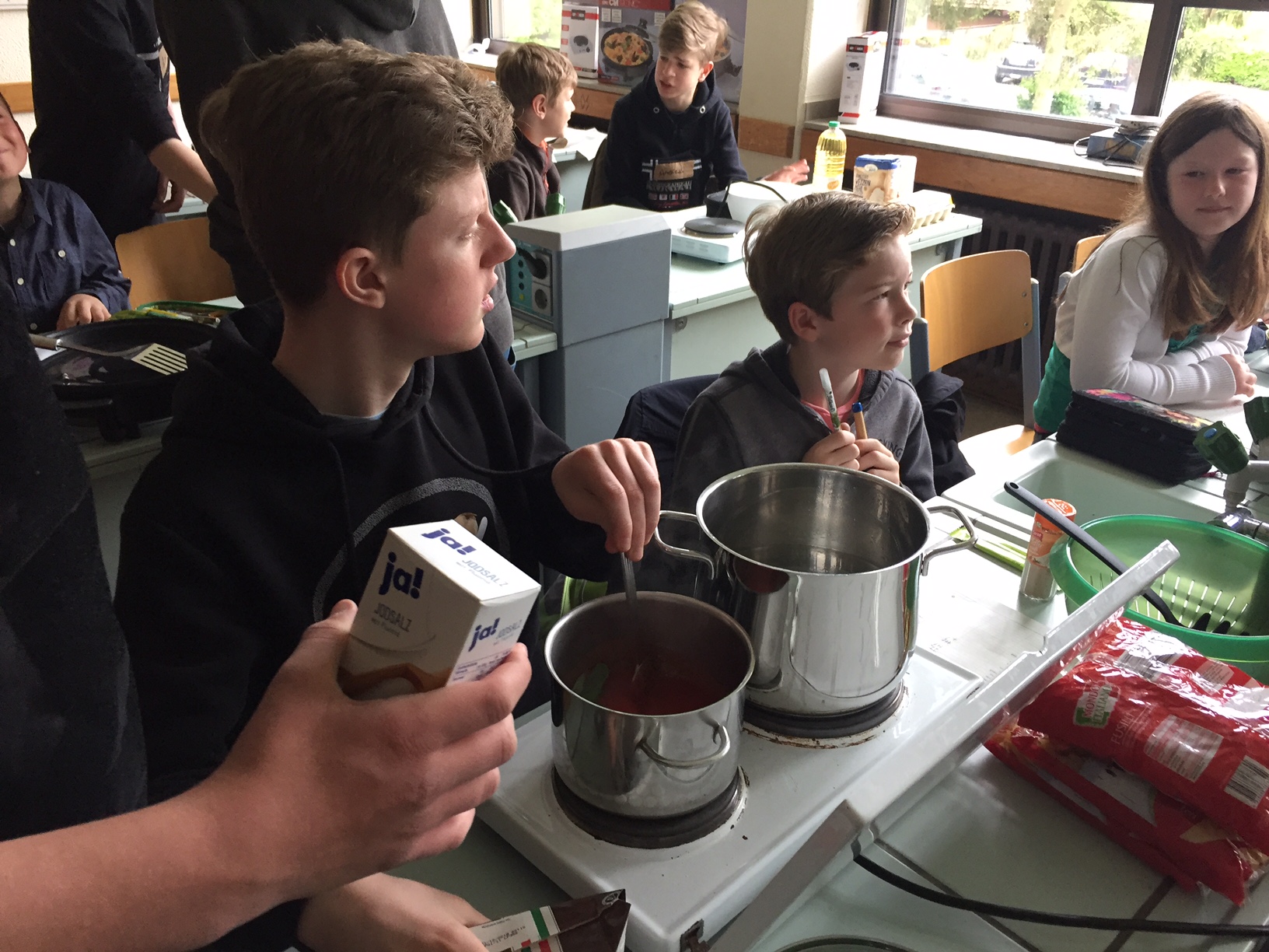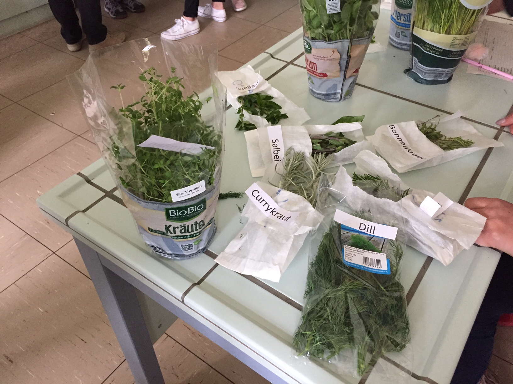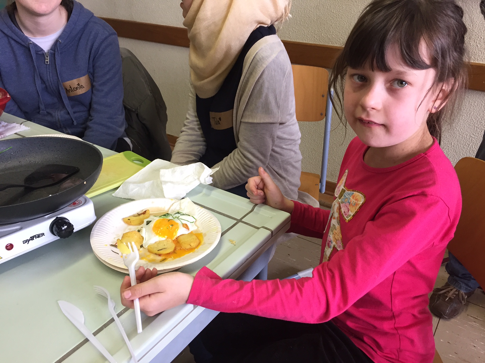 Am 3.5. war die Klasse 3a im Städtischen Gymnasium zu Gast und nahm an dem Projekt "Kochen mit Kräutern" teil. Zunächst hielten ein paar Kinder der Klasse 8 ein tolles Referat zum Thema Nutzpflanzen. Dann bekamen die 3.-Klässler jeweils einen Partner aus der Klasse acht und dann ging es auch schon an die Kochtöpfe. Es gab Bratkartoffeln, Nudeln mit Sauce und auch Pfannekuchen - alles mit Kräutern.