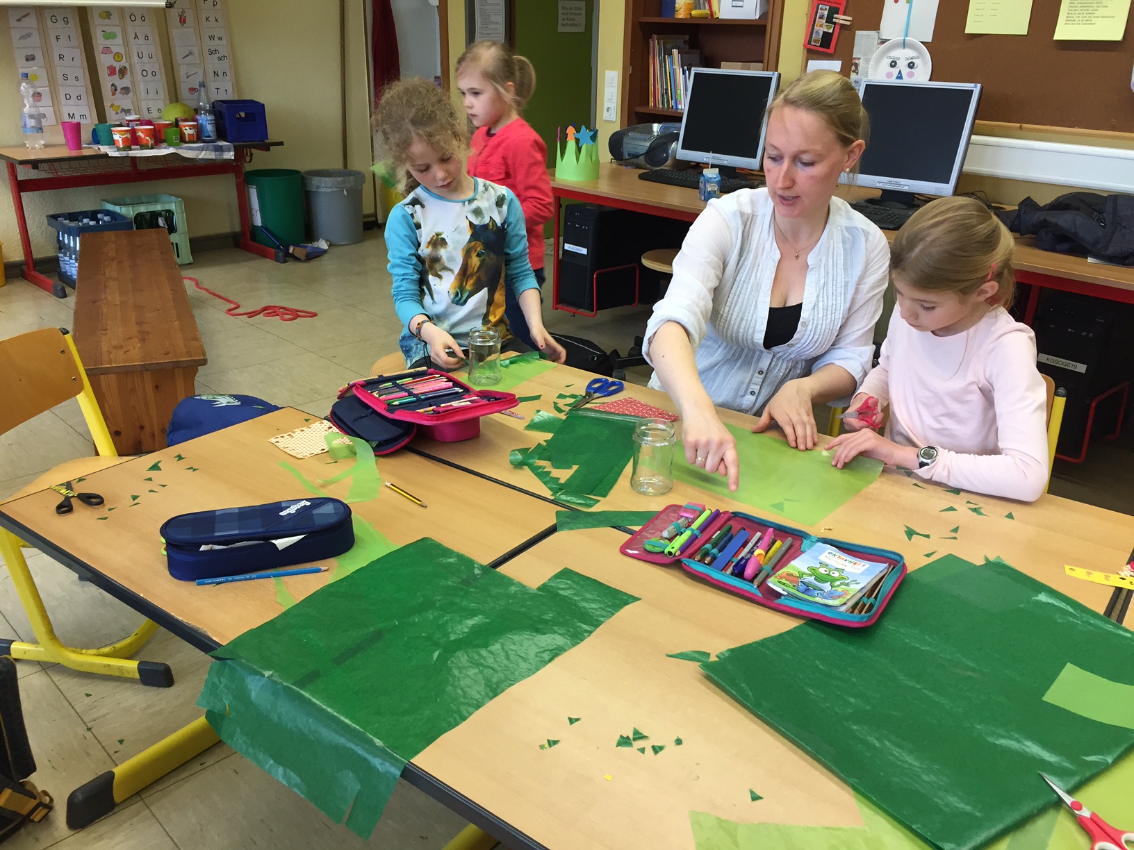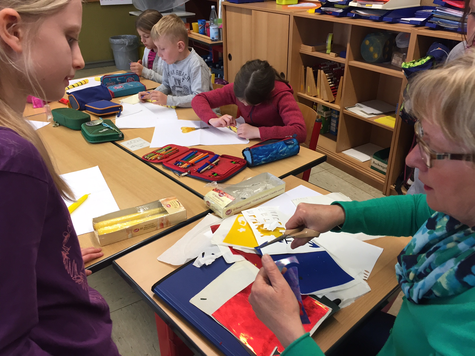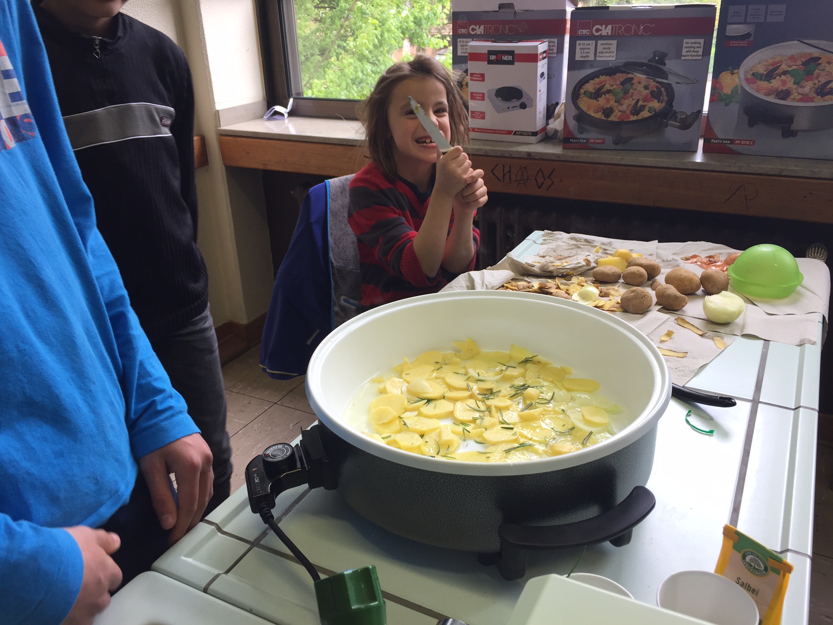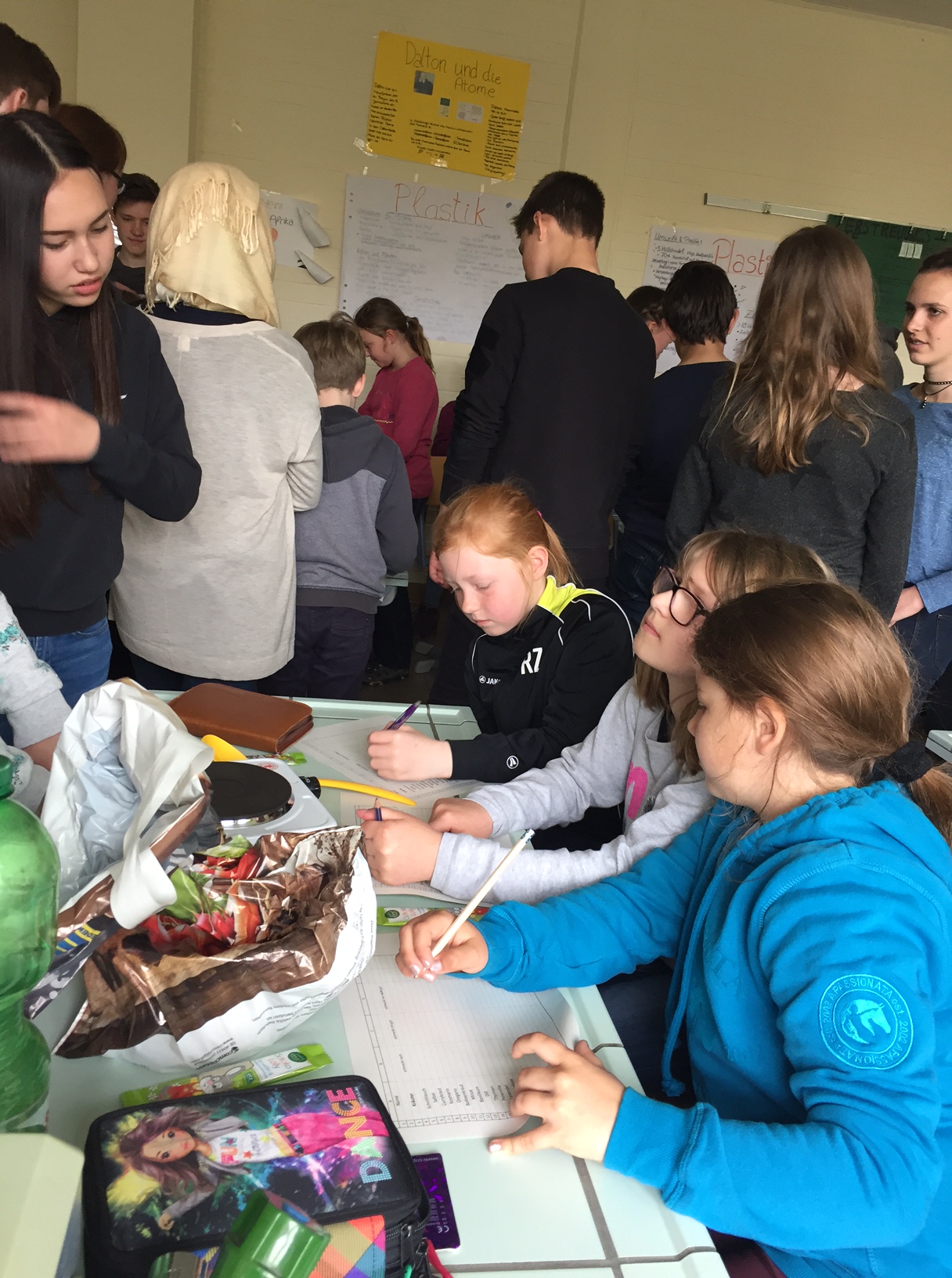 Am 3.5. war die Klasse 3a im Städtischen Gymnasium zu Gast und nahm an dem Projekt "Kochen mit Kräutern" teil. Zunächst hielten ein paar Kinder der Klasse 8 ein tolles Referat zum Thema Nutzpflanzen. Dann bekamen die 3.-Klässler jeweils einen Partner aus der Klasse acht und dann ging es auch schon an die Kochtöpfe. Es gab Bratkartoffeln, Nudeln mit Sauce und auch Pfannekuchen - alles mit Kräutern.