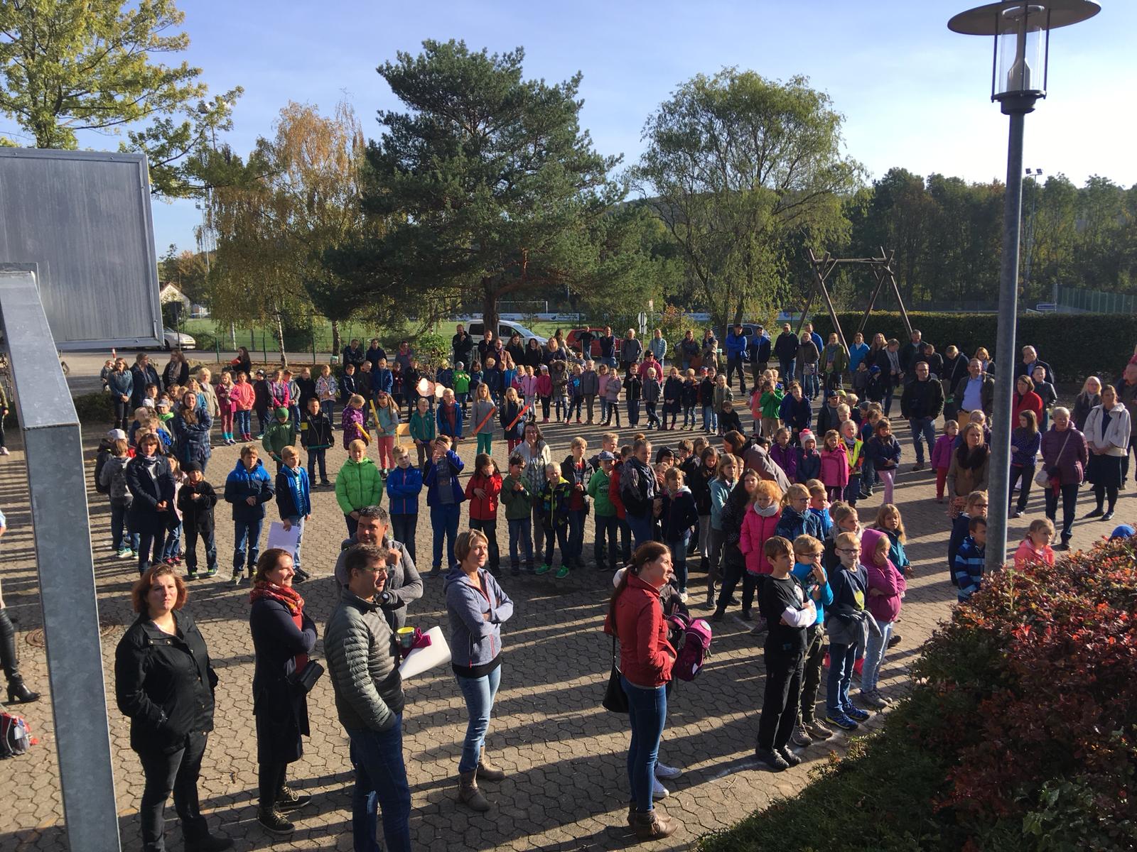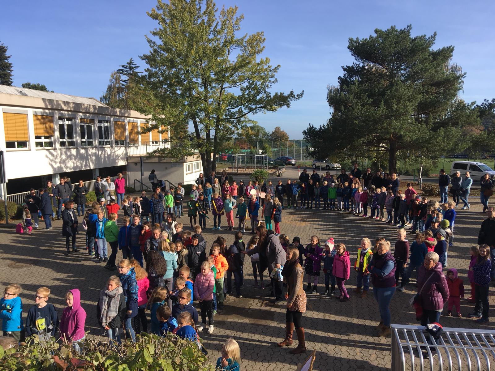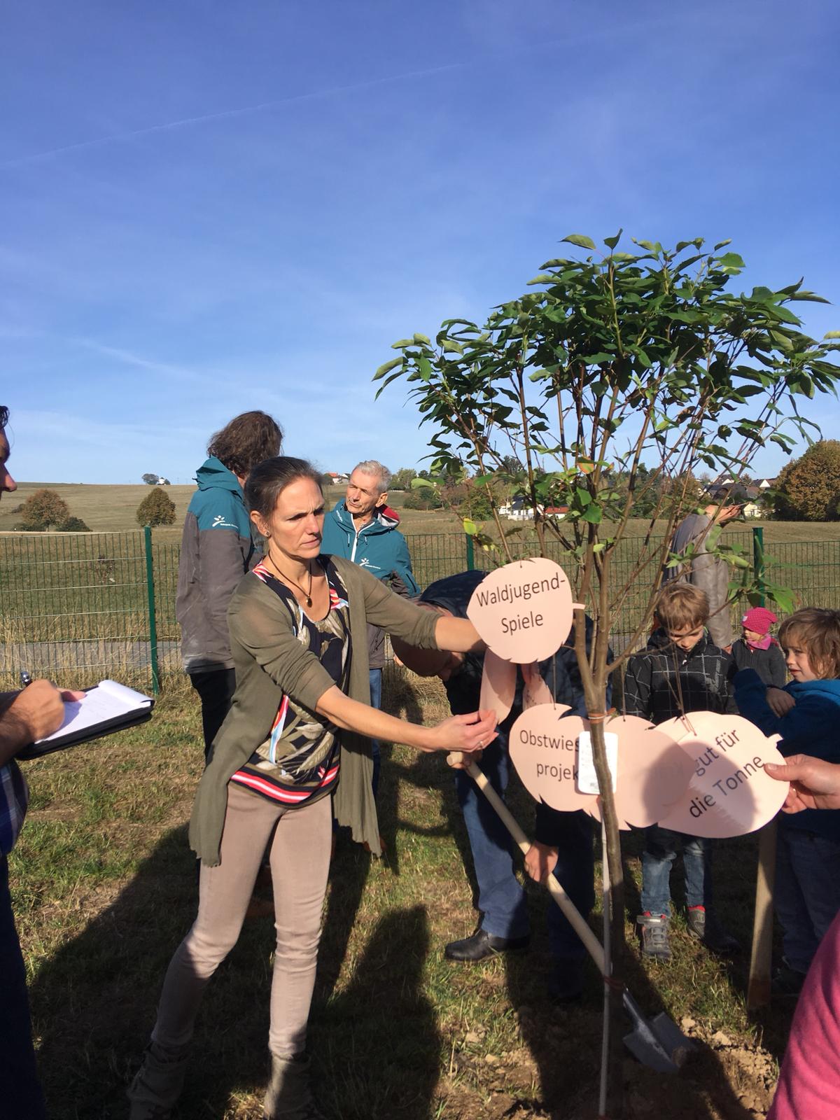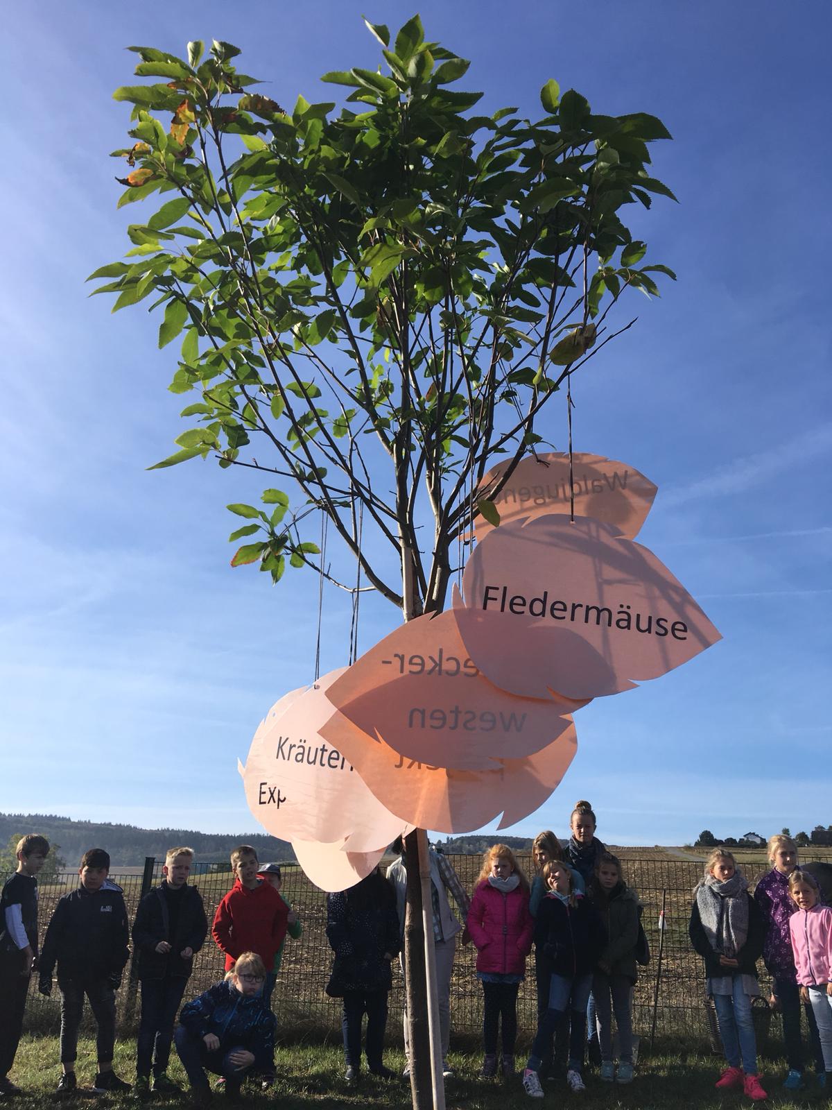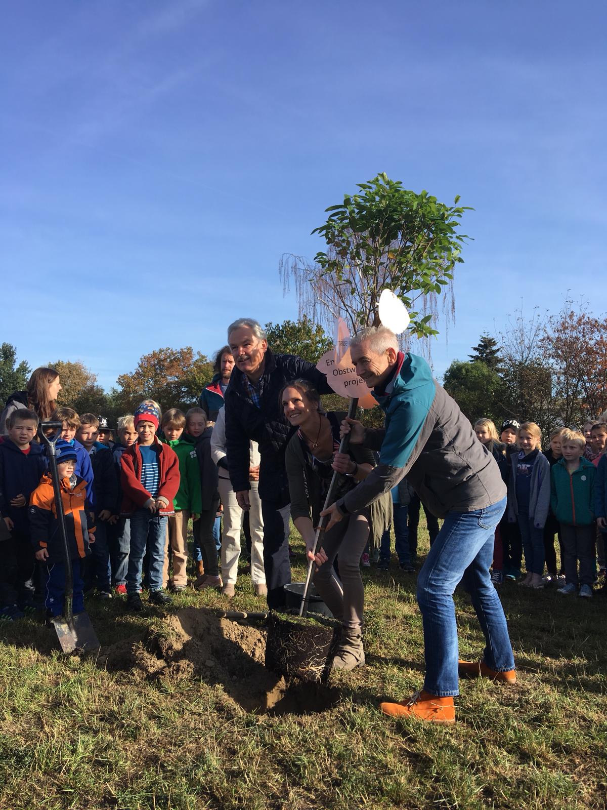 Die Klassen hatten für die Verleihung ein kleines Rahmenprogramm vorbereitet. Als kleines Bonbon bekam die Schule 30 Entdeckerwesten, mit denen ab sofort die Natur erkundet werden kann. Zum Abschluss wurde eine Felsenbirne an unserem neuen Klettergerüst gepflanzt - hierbei half sogar Herr Bürgermeister Stefan Raetz fleißig mit.