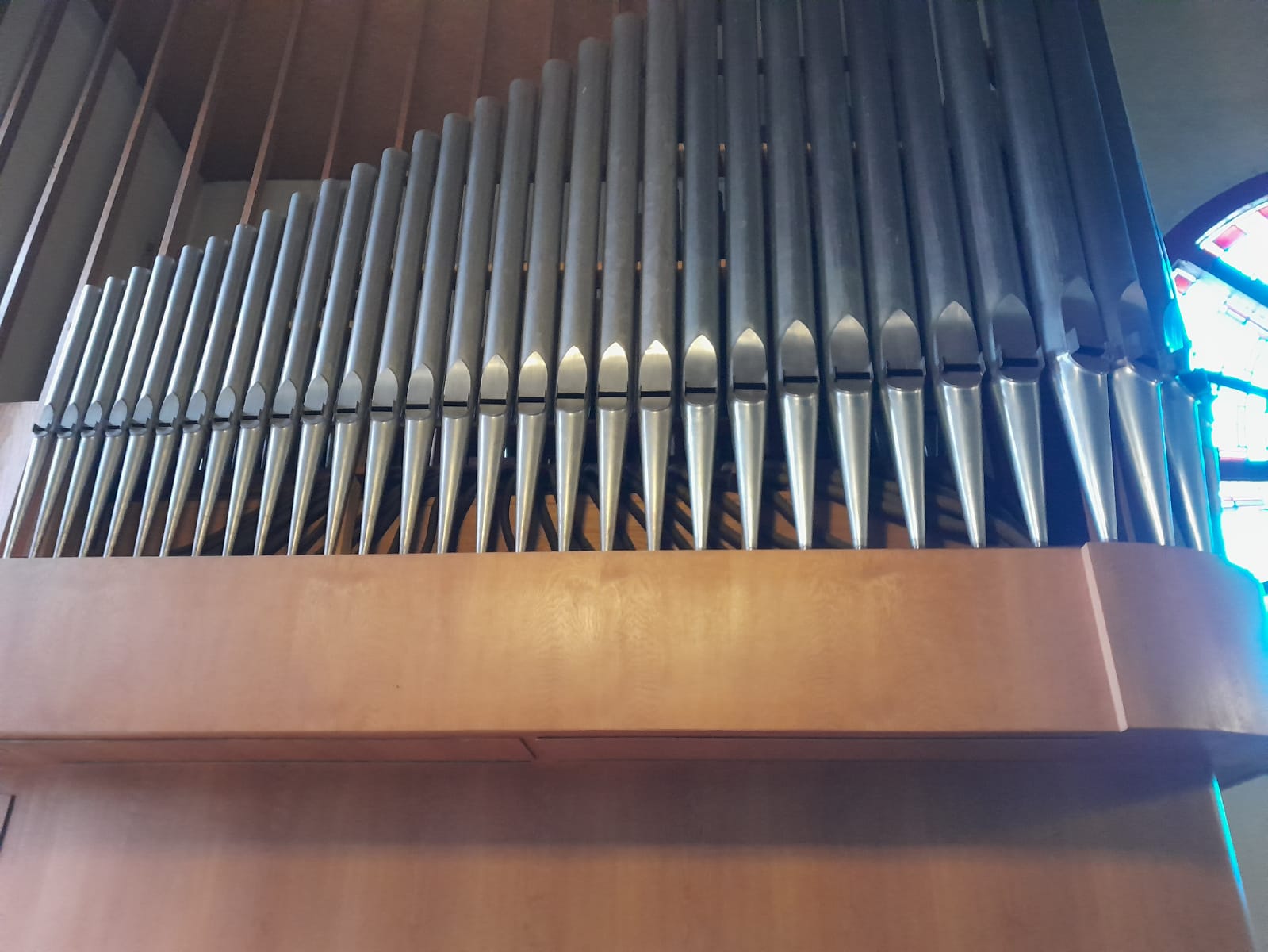 Unser Ziel mit dem Bus war die Kirche in Wormersdorf, wo wir von dem Organisten empfangen wurden. Er war aber nicht allein, wie sich kurz nach Beginn des Konzertes herausstellte, sondern hatte die Maus Charly dabei, die allerhand Fragen hatte und gemeinsam mit uns viel über die Orgel gelernt hat. So wissen wir nun beispielsweise Bescheid über Register, Manuale, das Pedal, aus welchem Material Orgelpfeifen hergestellt werden und kennen das Geheimnis, woher für Orgeln früher und heute der Wind "wehte"...